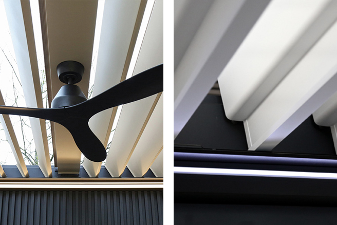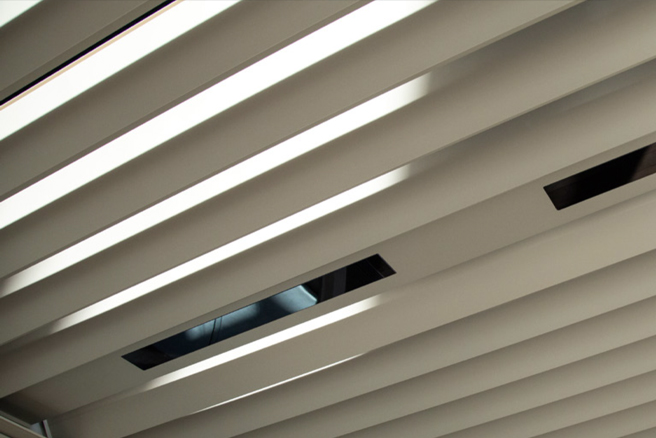 Protecto: Profil de protection optionnel entre les lames et la gouttière. Ce profil offre une protection contre le vent, la pluie fine et la neige qui peuvent pénétrer dans la pergola entre les lames et le cadre.