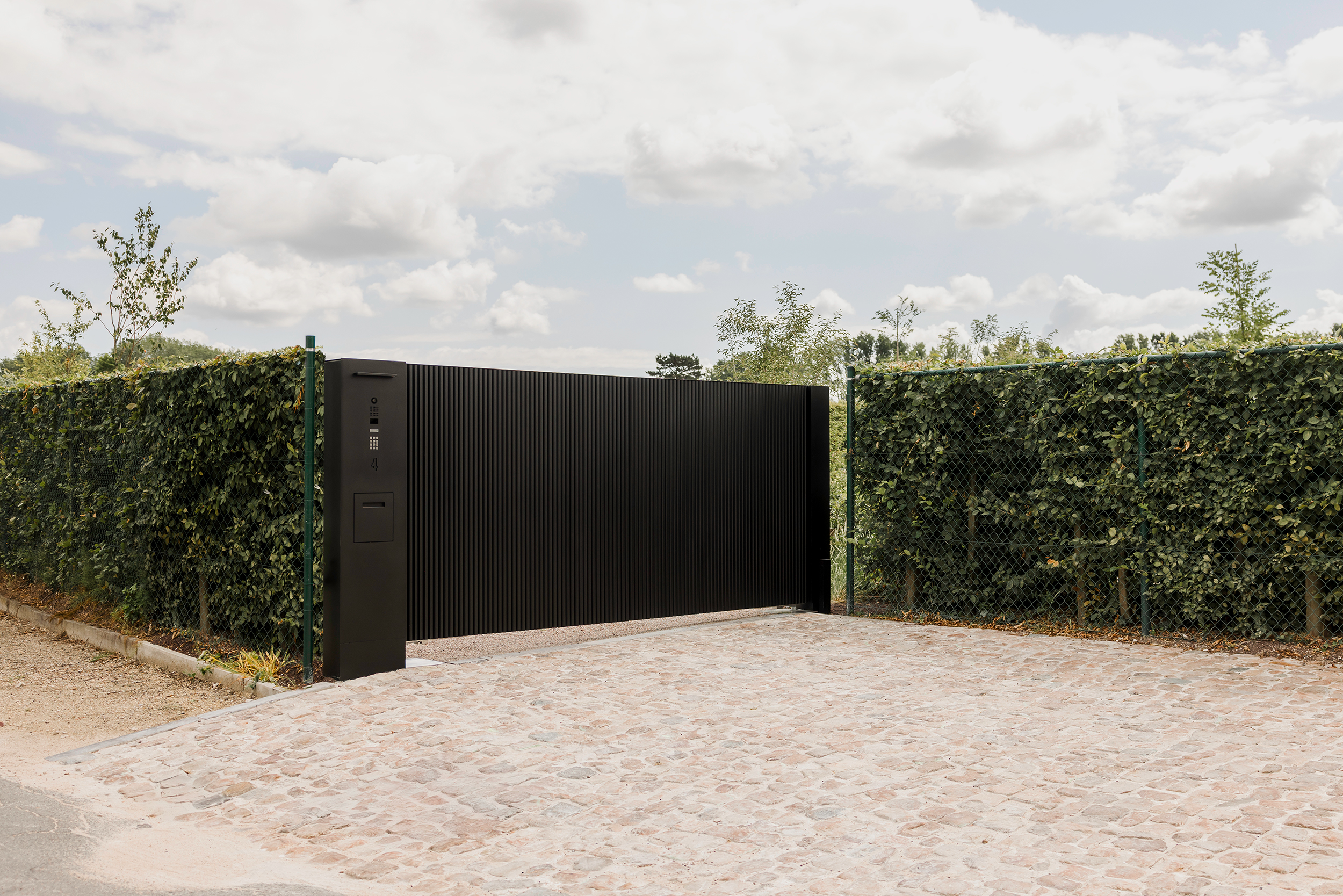 Du casier à colis au vidéophone, en passant par le clavier à code et l’éclairage, tous les composants sont intégrés de manière invisible et élégante dans les colonnes du portail. Cette approche seamless garantit une fonctionnalité maximale, sans aucune surcharge visuelle.